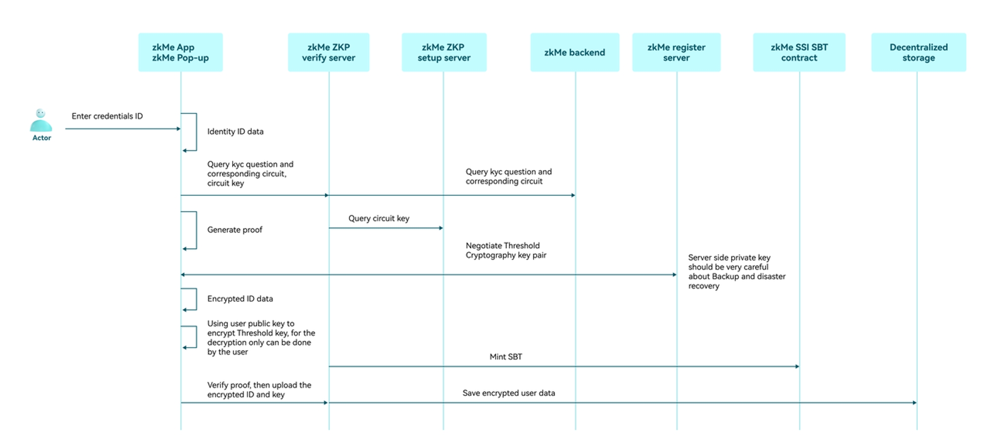 The zkMe protocol implements a (2/2) threshold cryptosystem (to be expanded to 3/3 in future iterations, see below).