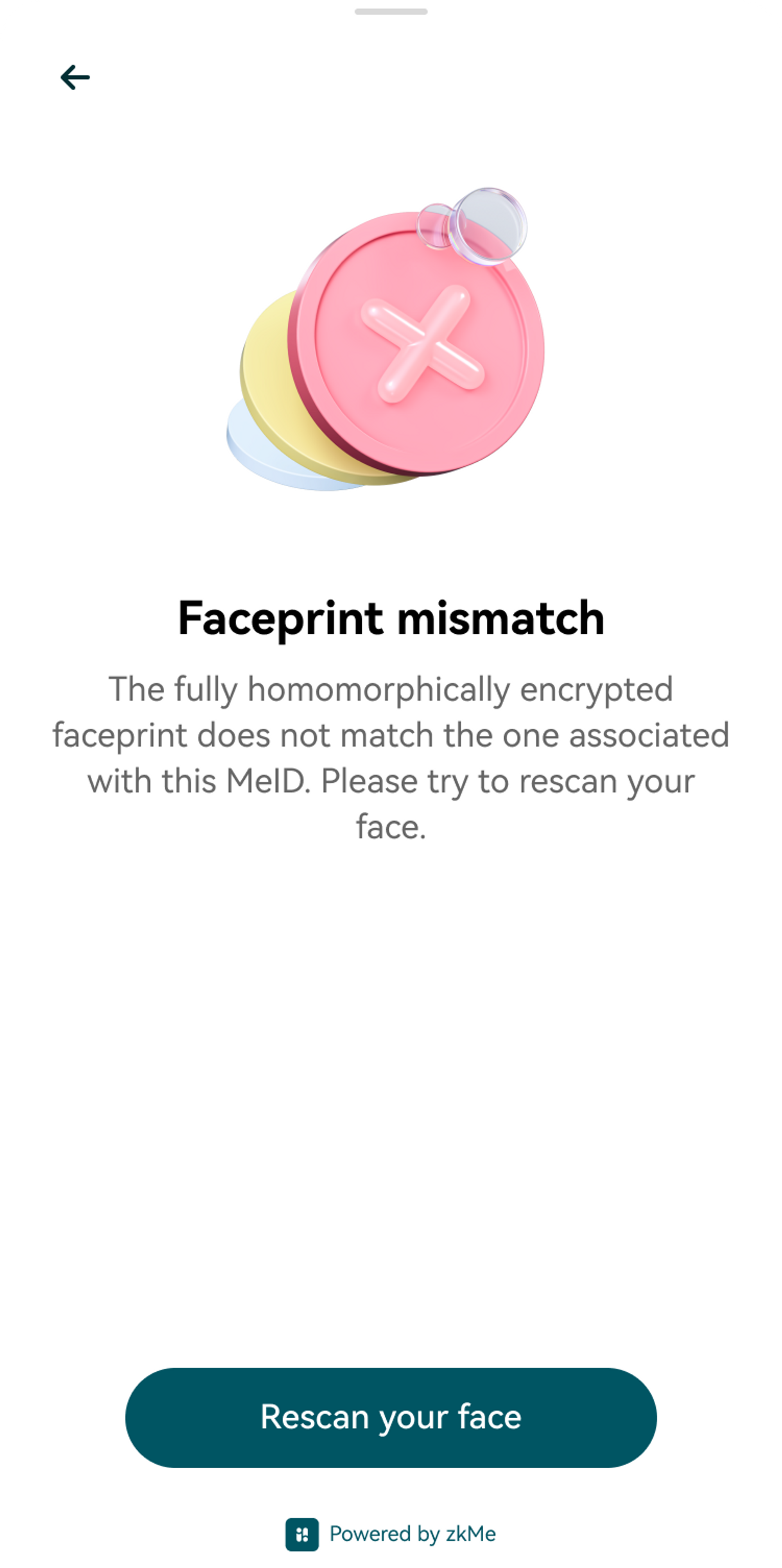 The following screen will be displayed for the possible problem that the fully homomorphically encrypted faceprint does not match the one associated with this MeID.