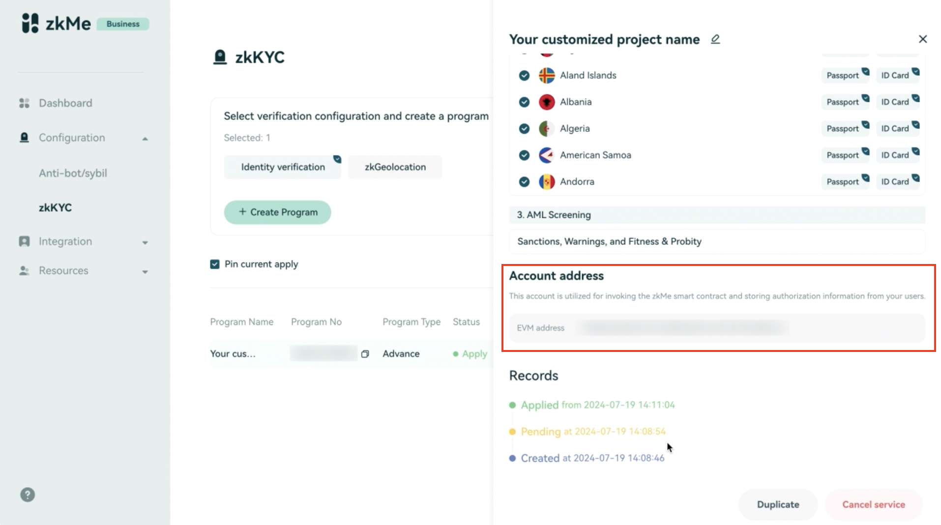 **Note:** You can obtain the `cooperator` address after completing the "Create Program" step on the [zkMe Dashboard](https://docs.zk.me/hub/start/onboarding/dashboard).