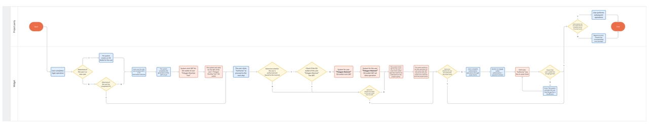 During the initial binding of the asset wallet to a chain, it includes creating an SBT on the user's SSI wallet on Polygon, setting data on the SBT, and obtaining user consent for authorization via a pop-up interface in widget. The user's authorization information is then transmitted to the project through zkMe's API.