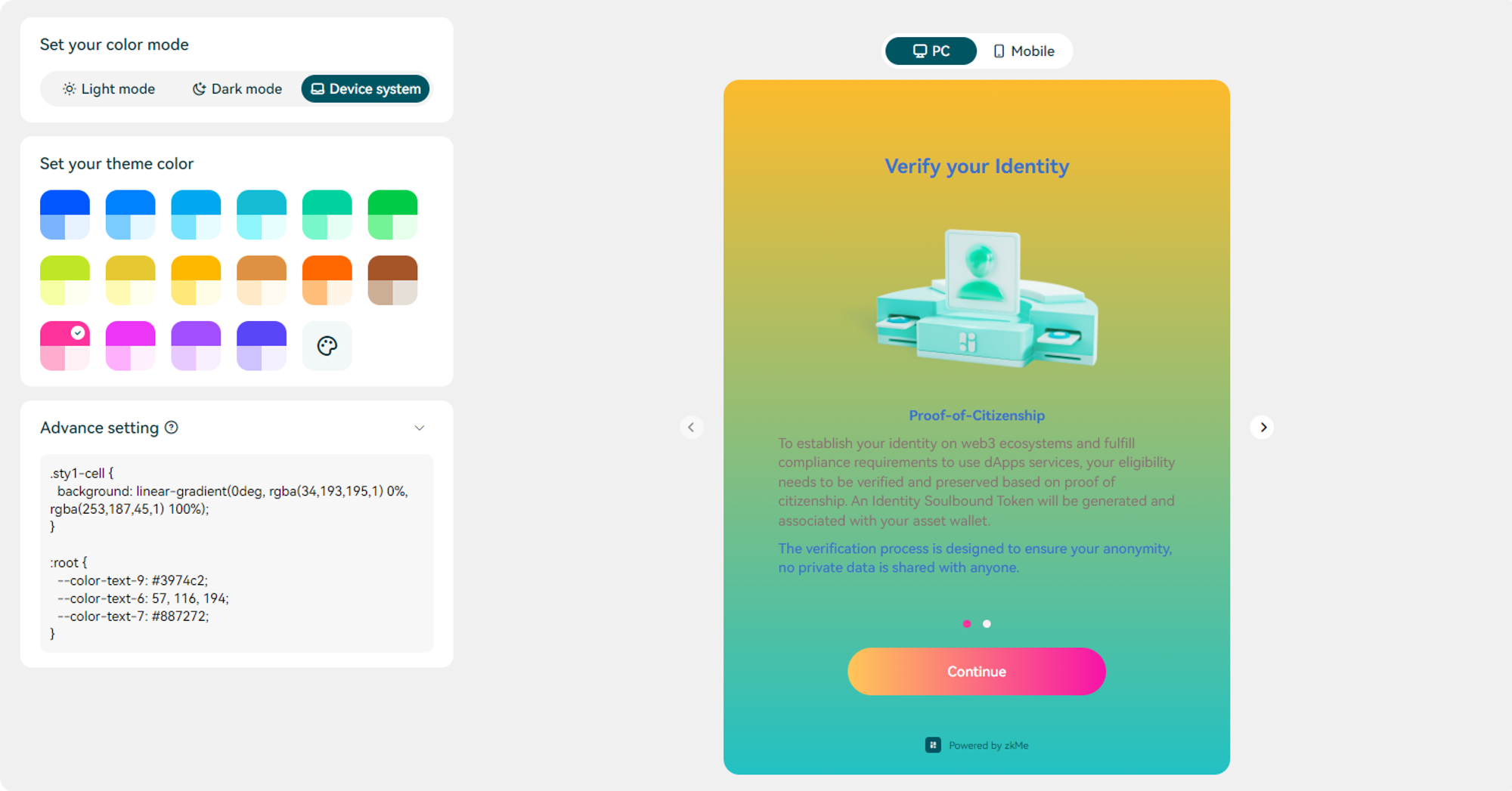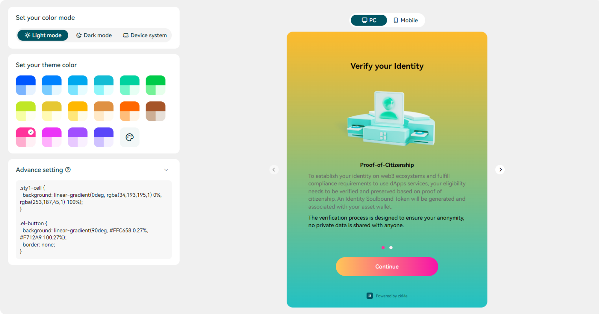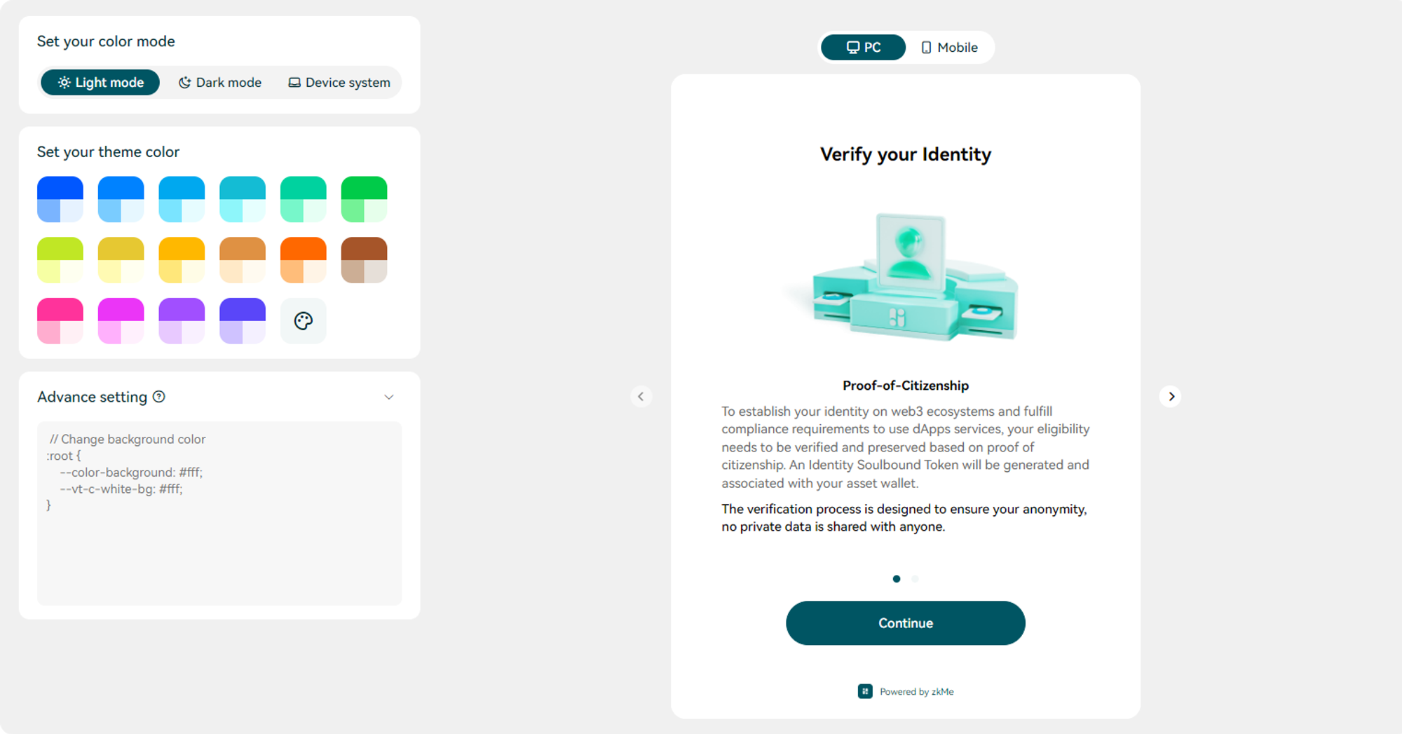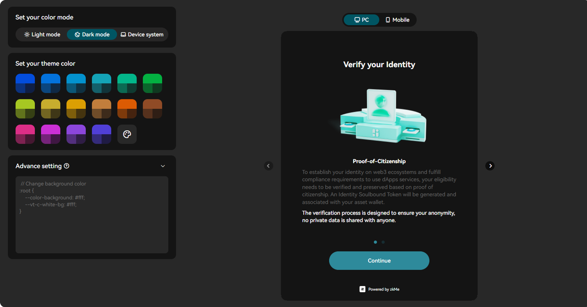 As it stands, the zkMe Widget's default color mode aligns with the system settings. This means that the widget's background color, icon background color, and font color adapt to the display mode on the user's device. However, selecting either Light mode or Dark mode overrides this functionality, meaning the color style will then remain constant, regardless of changes to the user's system settings.