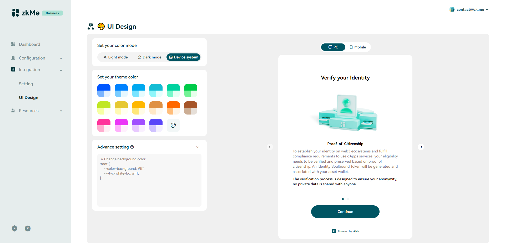 In our dashboard, you now have the ability to alter the zkMe Widget style, including font color, background color, and more. This provides you with the flexibility to adapt the zkMe Widget to fit your project needs or personal preferences effectively.