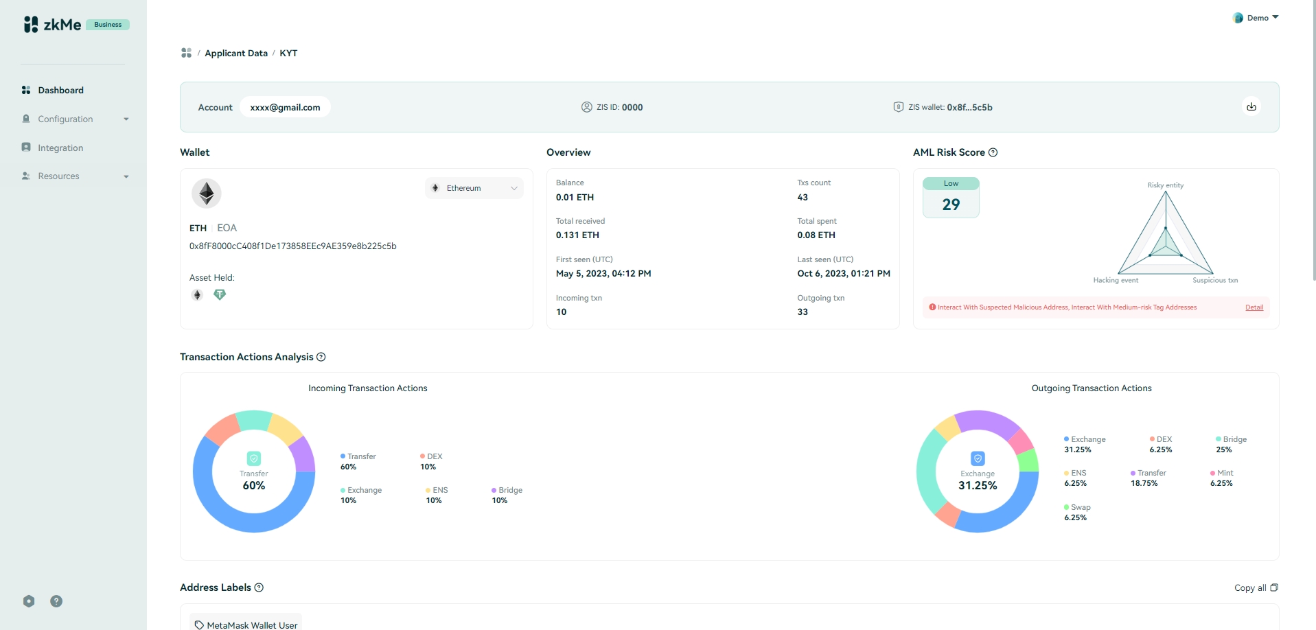 With the help of KYT, the zkMe Dashboard enables real-time tracking and analysis of transaction data, making it possible to spot and tackle any suspicious activities promptly. Now, zkMe Dashboard offers the capability to explore wallets on various networks including Ethereum, Polygon (MATIC), Arbitrum, and Base among other (see KYT Supported Scope for the full list). We're planning to extend our support to even more networks in the near future.
