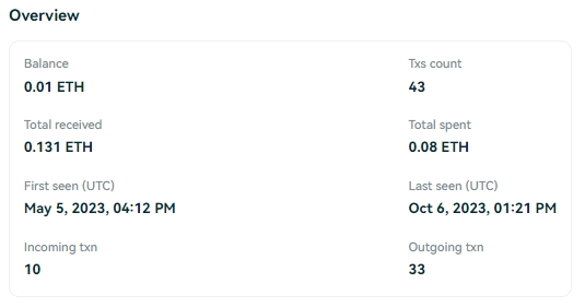 This widget serves as a concise overview of the wallet's transaction history on this chain. It provides key details such as balance, total transaction count, timestamps of the first and most recent transactions, and more.